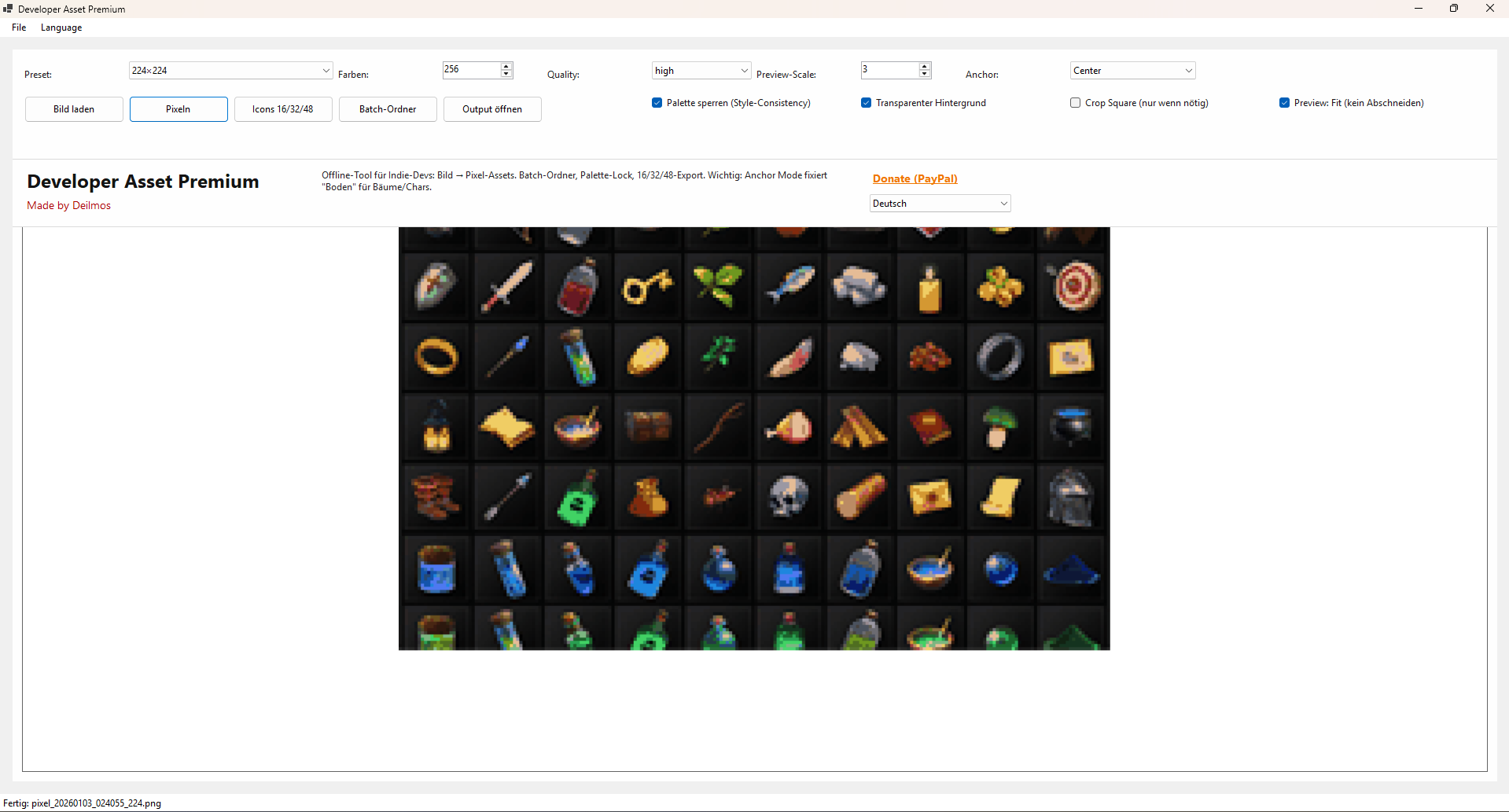 Developer Asset Premium is an offline desktop tool for indie game developers that converts images into usable pixel-art assets.